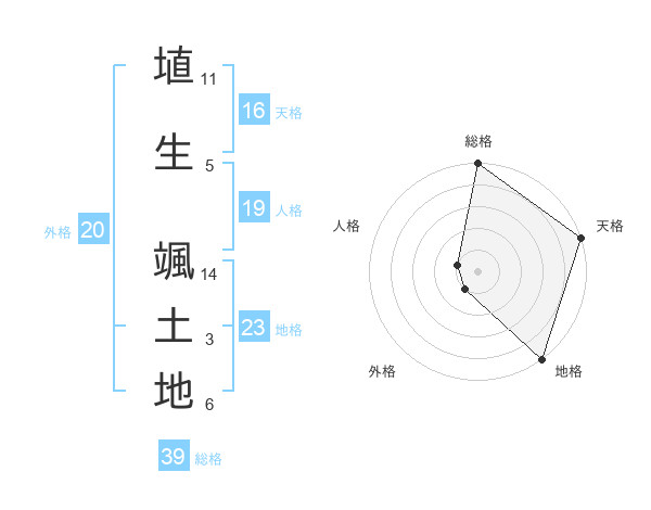埴生 颯土地さんの総格は39画の5点!