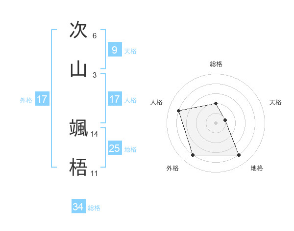 次山 颯梧さんの総格は34画の2点!