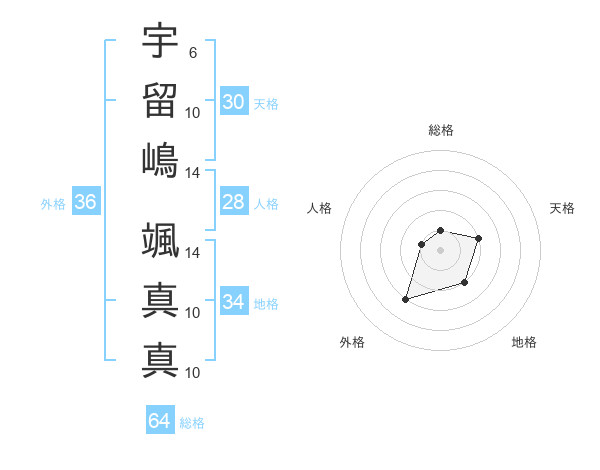宇留嶋 颯真真さんの総格は64画の1点!