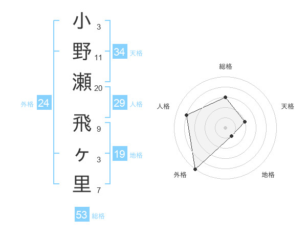 小野瀬 飛ヶ里さんの総格は53画の3点