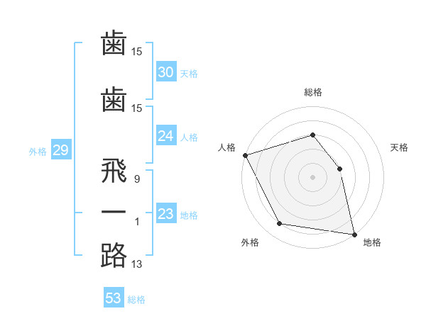 歯歯 飛一路さんの総格は53画の3点!