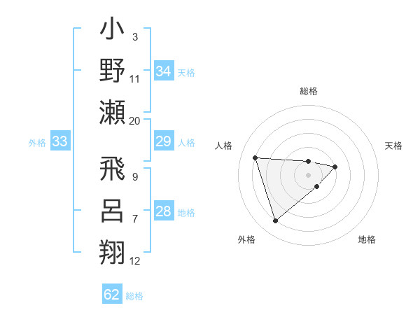 小野瀬 飛呂翔さんの天格は34画の2点!