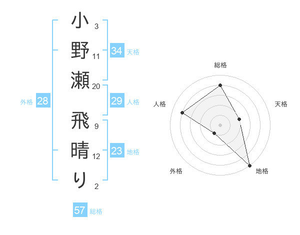 小野瀬 飛晴りさんを姓名の画数から五運を鑑定