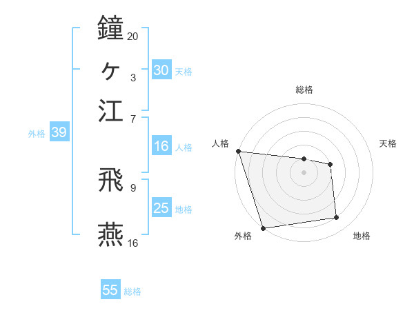 鐘ヶ江 飛燕さんの総格は55画の1点!