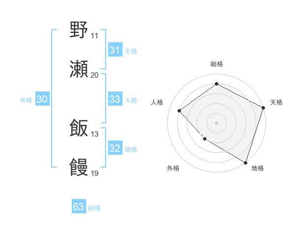 野瀬 飯饅さんの総格は63画の4点!