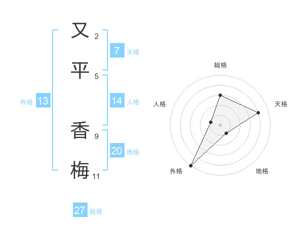 占い結果は姓名判断である以上、良い場合も悪い場合もありますが、決してお名前を誹謗中傷するものでなく、画数の自動計算によって得られたものです。また、本サイトの検索によって得られた鑑定結果で、第三者を誹謗中傷したり名誉を棄損するような行為を禁じます。