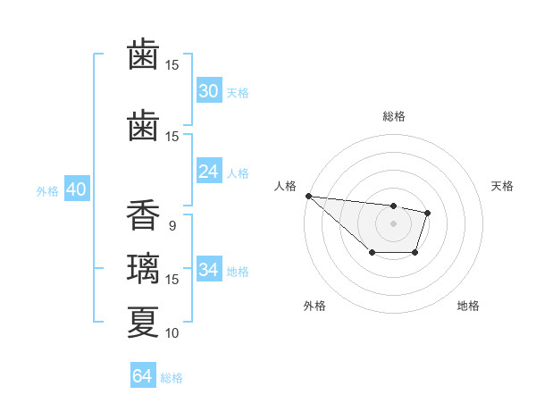 歯歯 香璃夏さんの総格は64画の1点!