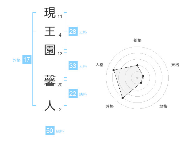 現王園 馨人さんを姓名の画数から五運を鑑定
