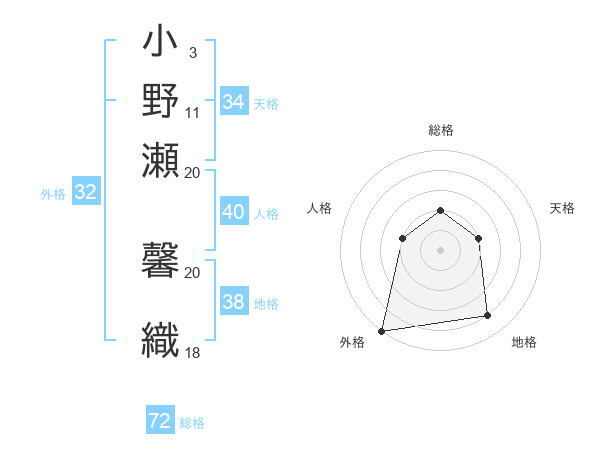 小野瀬 馨織さんの総格は72画の2点!