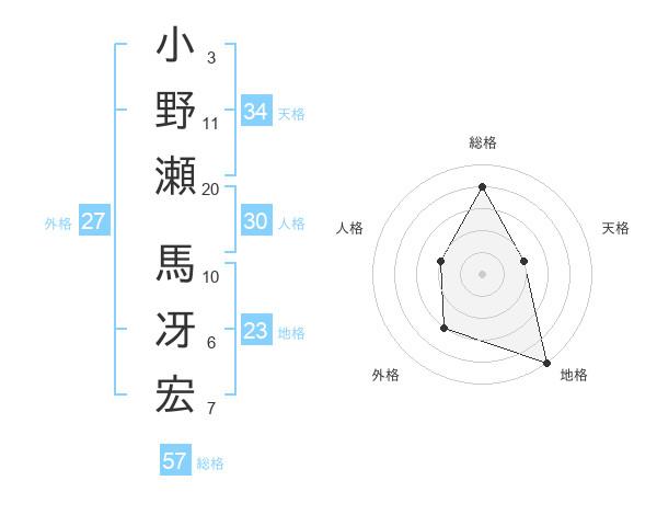 小野瀬 馬冴宏さんの総格は57画の4点!