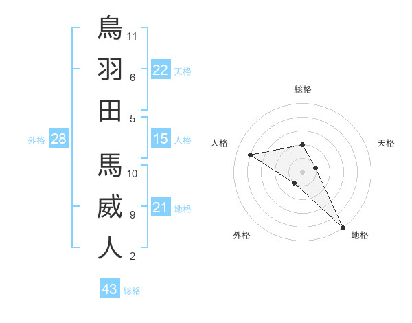 鳥羽田 馬威人さんの総格は43画の2点