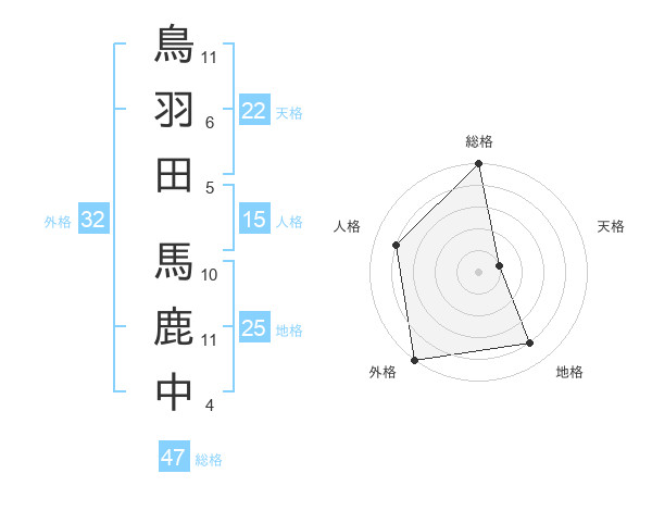 鳥羽田 馬鹿中さんの総格は47画の5点!