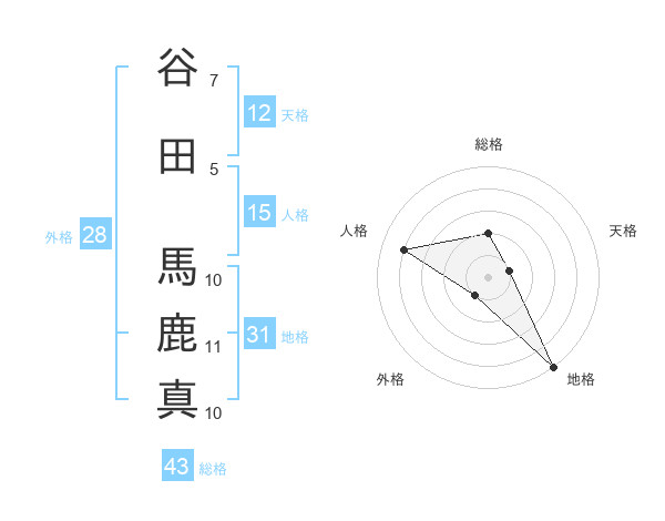 谷田 馬鹿真さんの総格は43画の2点!