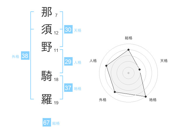 那須野 騎羅さんの総格は67画の4点!