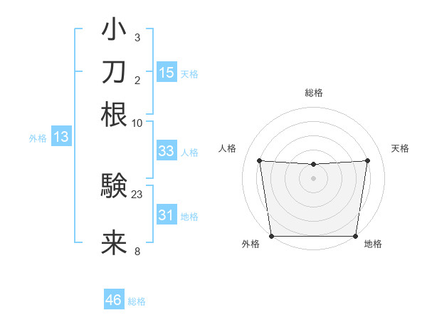 小刀根 験来さんを姓名の画数から五運を鑑定