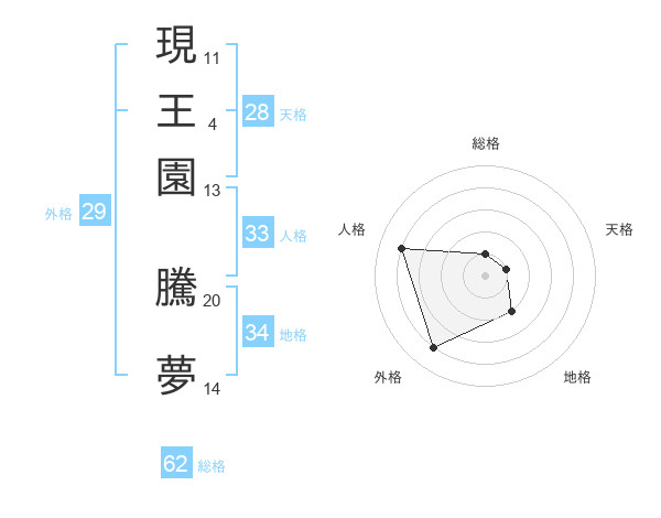 現王園 騰夢さんを姓名の画数から五運を鑑定