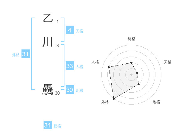 乙川 驫さんの総格は34画の2点!
