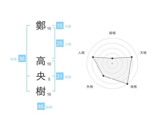 鄭 高央樹さんの総格は46画の1点!