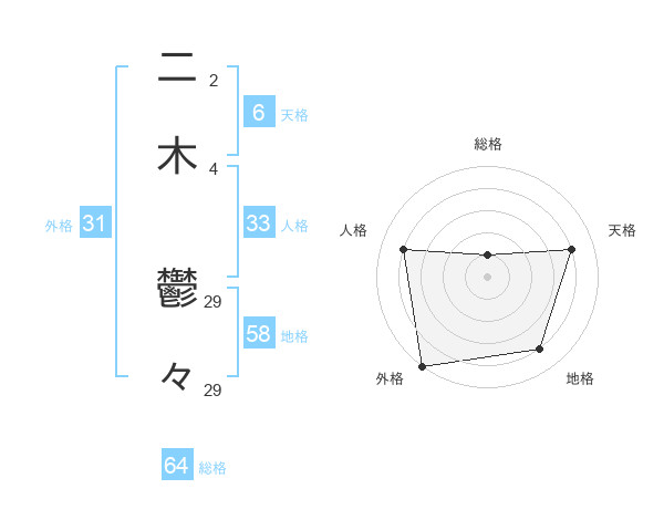 二木 鬱々さんの天格は6画の4点!