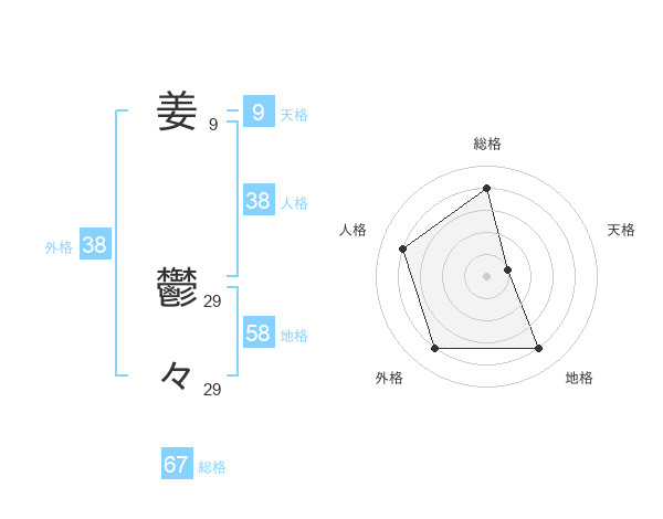 姜 鬱々さんの外格は38画の4点!