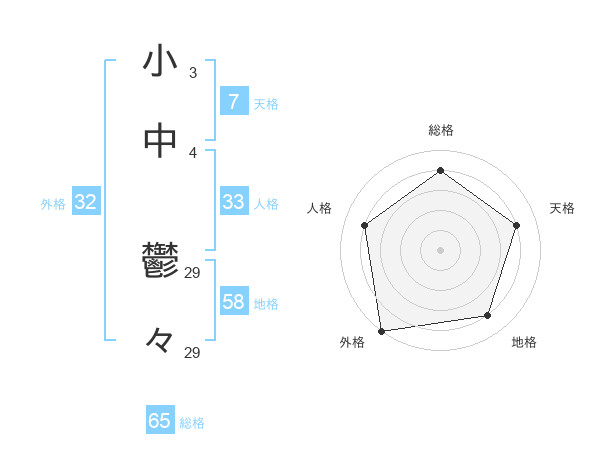 小中 鬱々さんの総格は65画の4点!