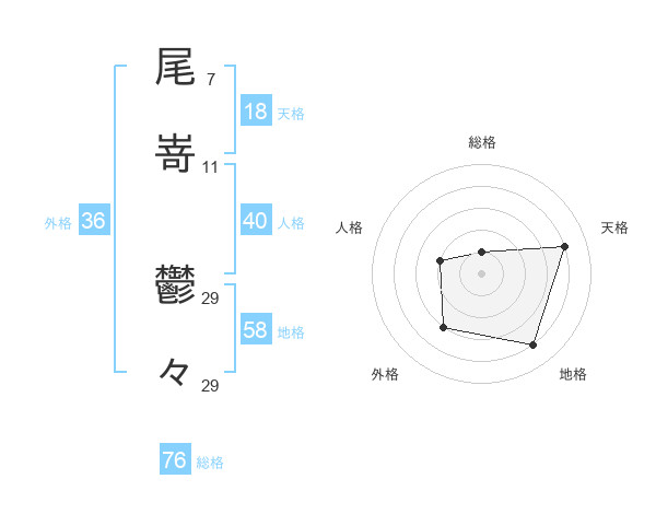 尾嵜 鬱々さんの総格は76画の1点!