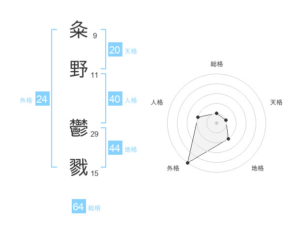 粂野 鬱戮さんの総格は64画の1点!