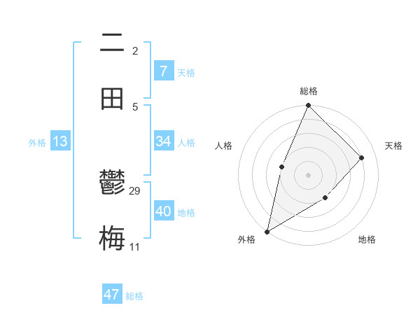 二田 鬱梅さんを姓名の画数から五運を鑑定