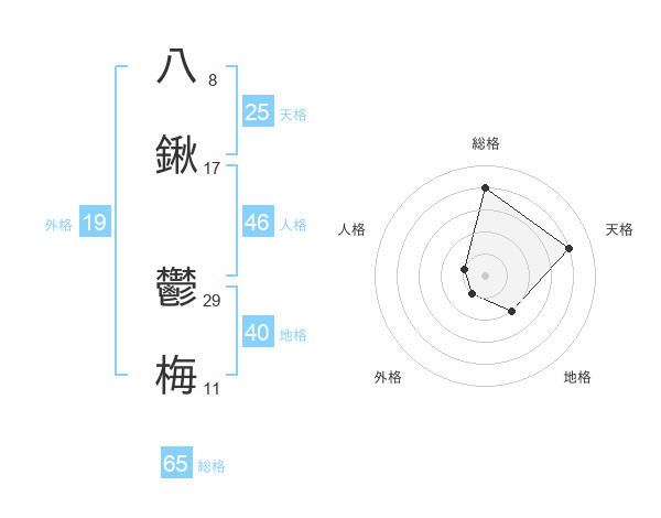八鍬 鬱梅さんの総格は65画の4点!