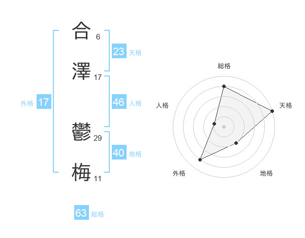 合澤 鬱梅さんの総格は63画の4点!