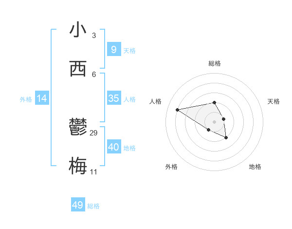 小西 鬱梅さんを姓名の画数から五運を鑑定