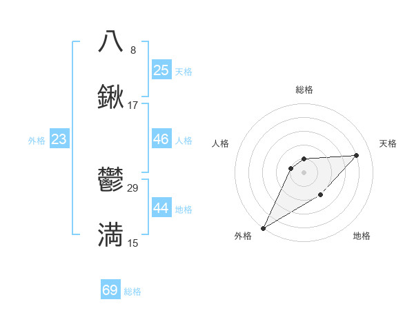 八鍬 鬱満さんの総格は69画の1点!