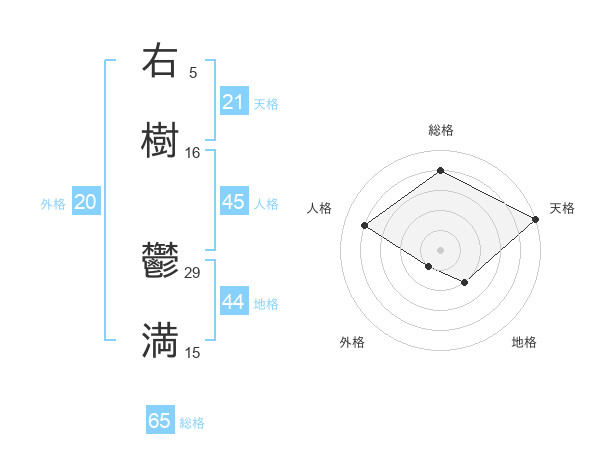 右樹 鬱満さんの総格は65画の4点!