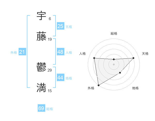 宇藤 鬱満さんの総格は69画の1点!