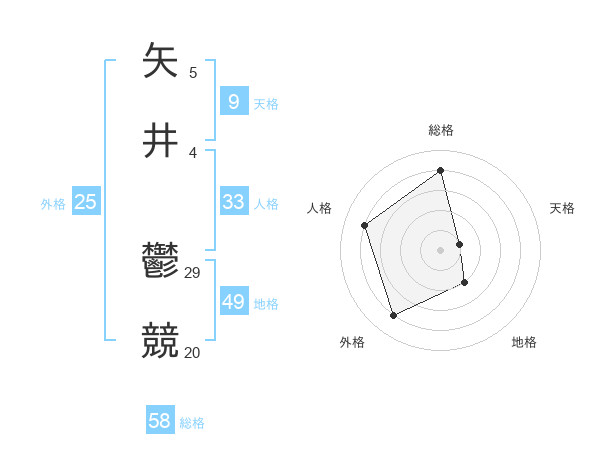 矢井 鬱競さんを姓名の画数から五運を鑑定