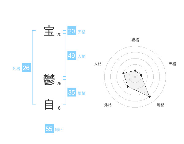 宝 鬱自さんの総格は55画の1点!