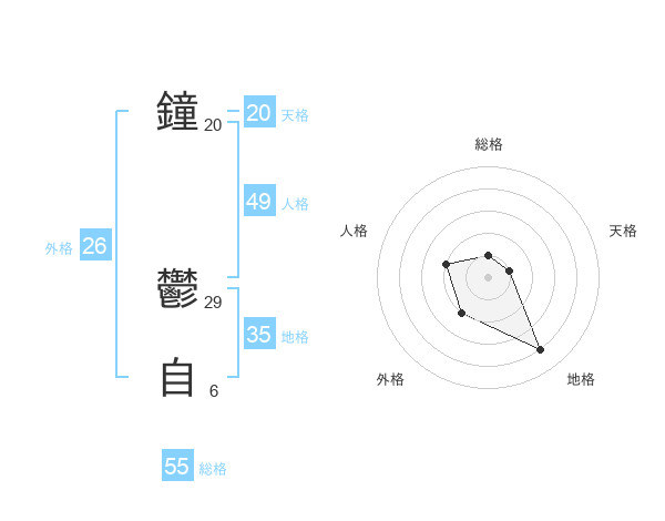 鐘 鬱自さんを姓名の画数から五運を鑑定