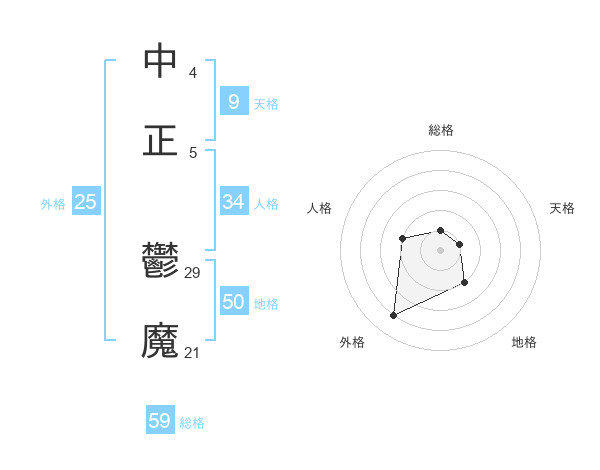 中正 鬱魔さんを姓名の画数から五運を鑑定