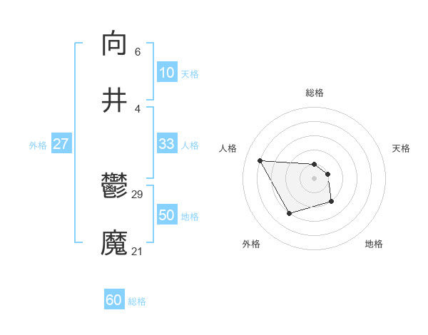 向井 鬱魔さんを姓名の画数から五運を鑑定