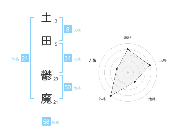 土田 鬱魔さんを姓名の画数から五運を鑑定