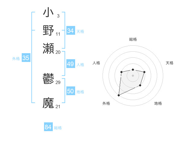 小野瀬 鬱魔さんを姓名の画数から五運を鑑定