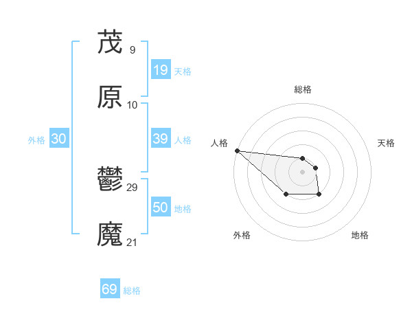 茂原 鬱魔さんの総格は69画の1点!