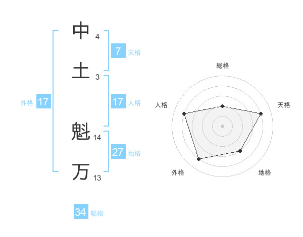 中土 魁万さんの総格は34画の2点!