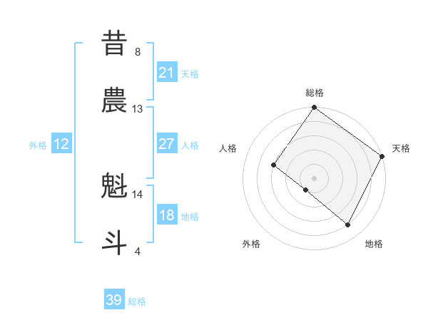 昔農 魁斗さんの総格は39画の5点!