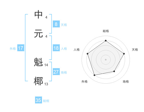 中元 魁椰さんの総格は35画の4点!