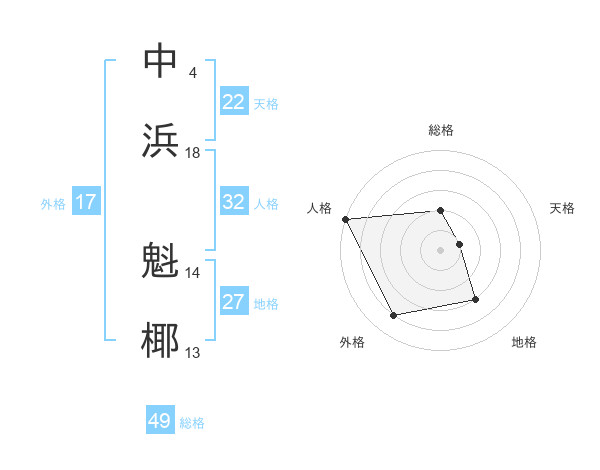 中浜 魁椰さんの総格は49画の2点!