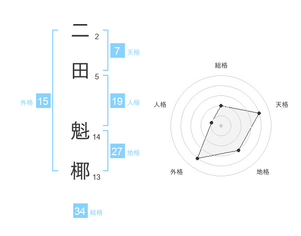 二田 魁椰さんの総格は34画の2点!