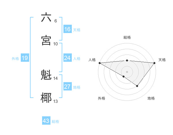 六宮 魁椰さんの総格は43画の2点!