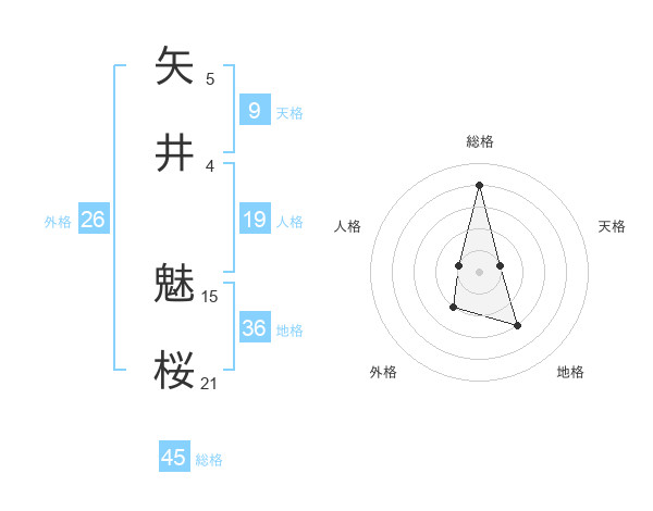 矢井 魅桜さんの総格は45画の4点!