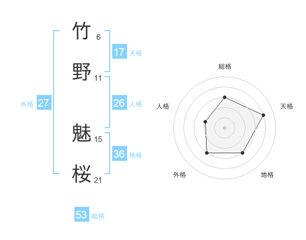 竹野 魅桜さんの総格は53画の3点!